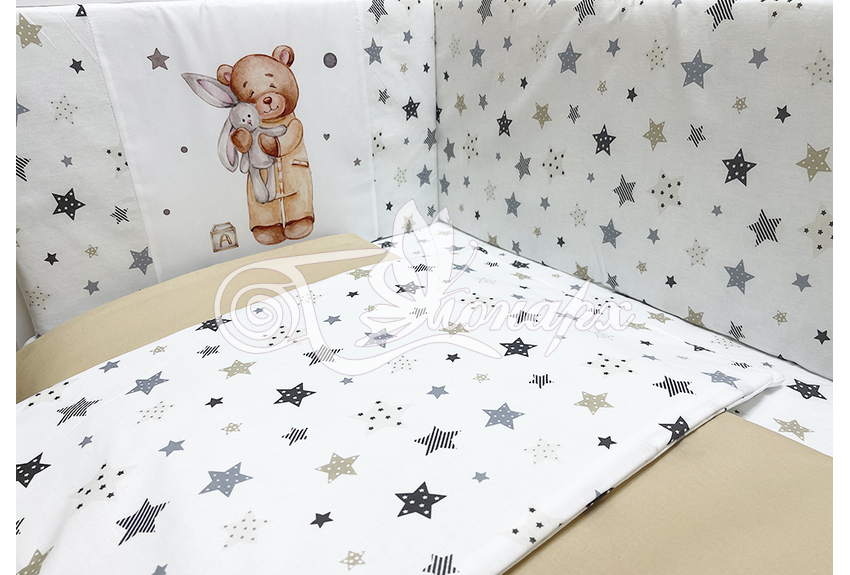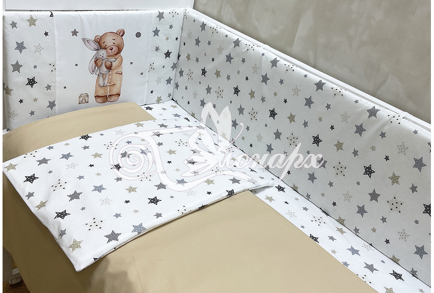 Бортики СО СЪЕМНЫМИ ЧЕХЛАМИ в кроватку: защитят Вашего малыша от ушибов, сквозняков, солнечных лучей и не дадут малышу запутаться в прутьях кроватки. - Простыня на резинке 60х120 см (подходит для стандартной кроватки)