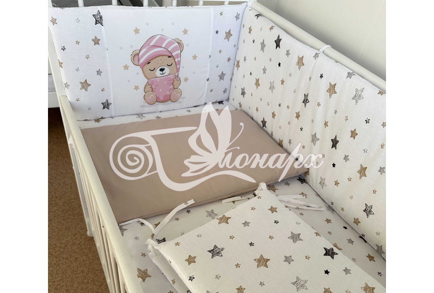 Бортики СО СЪЕМНЫМИ ЧЕХЛАМИ в кроватку: защитят Вашего малыша от ушибов, сквозняков, солнечных лучей и не дадут малышу запутаться в прутьях кроватки. - Простыня на резинке 60х120 см (подходит для стандартной кроватки)