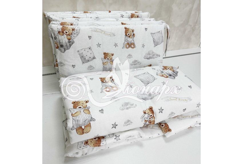 Бортики СО СЪЕМНЫМИ ЧЕХЛАМИ в кроватку: защитят Вашего малыша от ушибов, сквозняков, солнечных лучей и не дадут малышу запутаться в прутьях кроватки. - Простыня на резинке 60х120 см (подходит для стандартной кроватки)