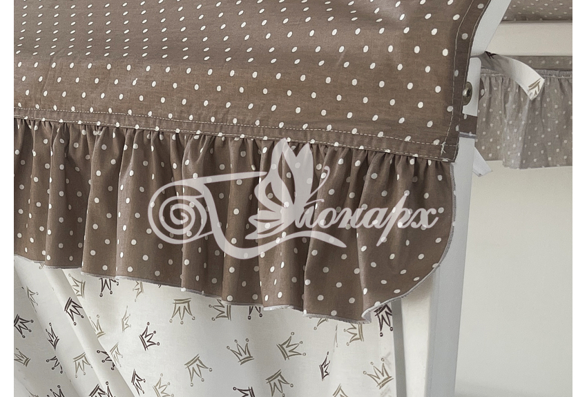 ширина - 137 см + 24 см на рюши (по 12 см на одну сторону). - Занавески с завязками (по 4 завязки на каждой занавеске) на переднюю сторону кроватки 2 шт.: