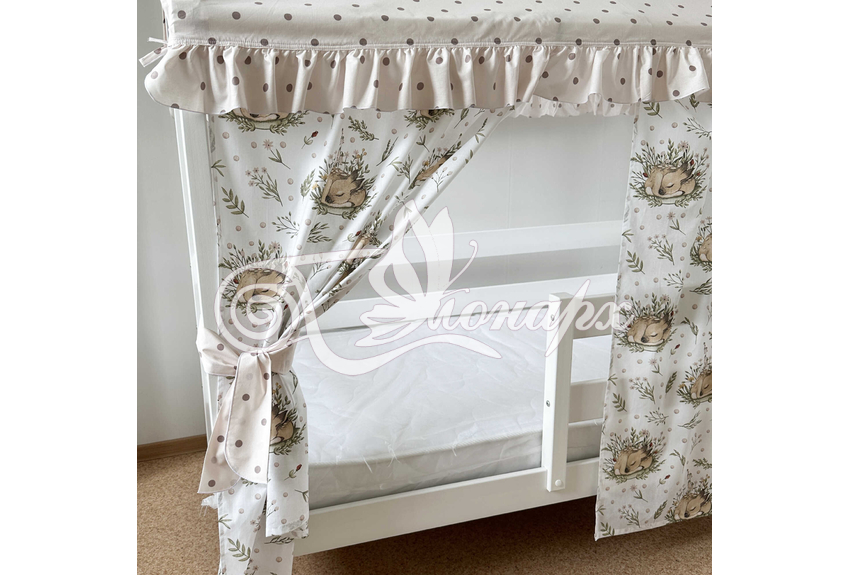 Крыша и шторы для кроватки домика ТД-42 купить в Томске.Теги: комплект в кроватку домик, текстиль для домика, крыша для домика