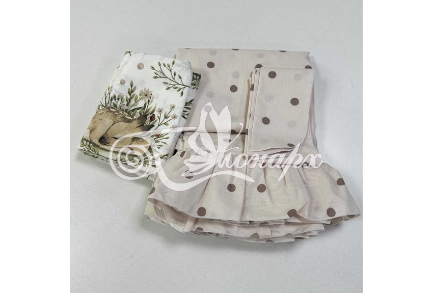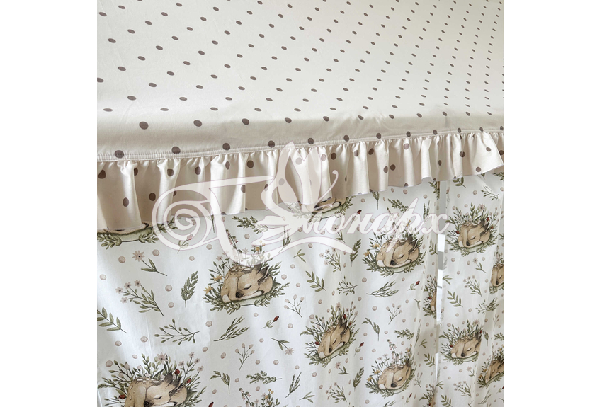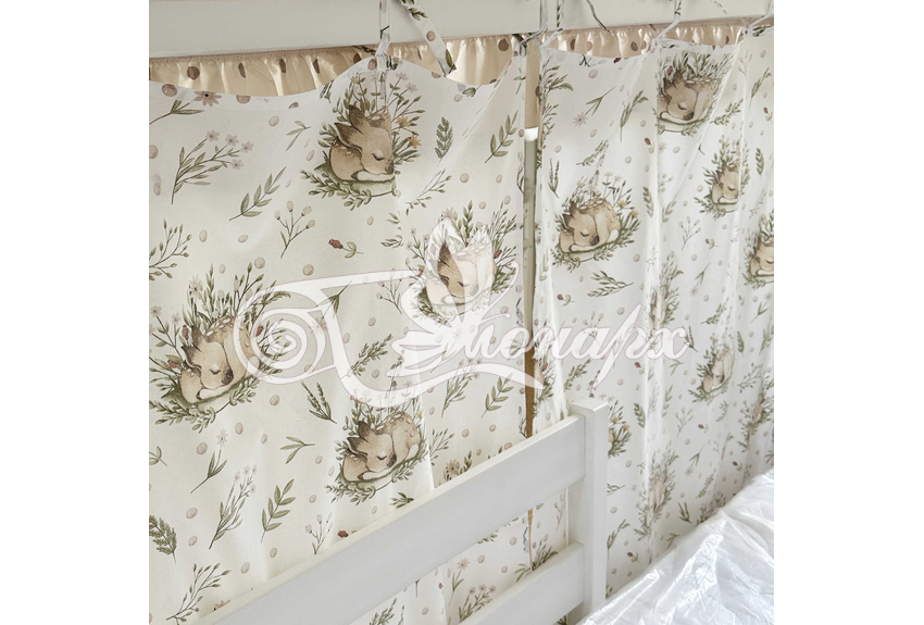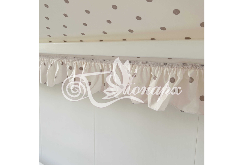 ширина - 137 см + 24 см на рюши (по 12 см на одну сторону). - Занавески с завязками (по 4 завязки на каждой занавеске) на переднюю сторону кроватки 2 шт.: