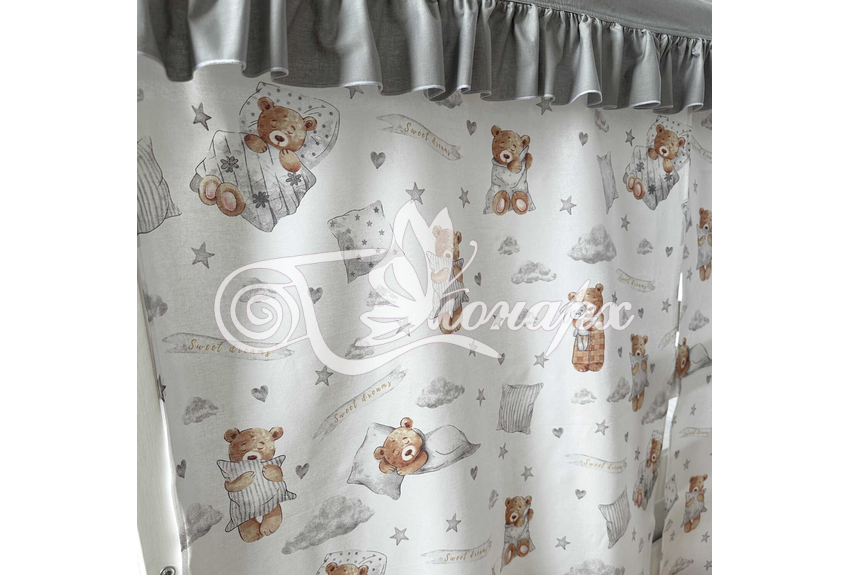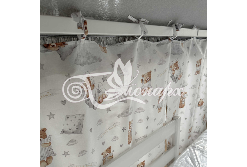 ширина - 137 см + 24 см на рюши (по 12 см на одну сторону). - Занавески с завязками (по 4 завязки на каждой занавеске) на переднюю сторону кроватки 2 шт.: